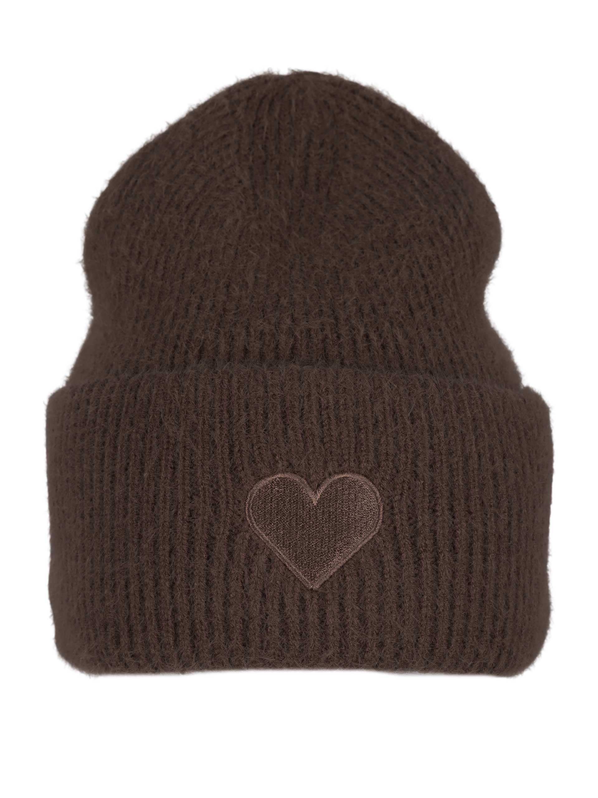Kuschelig warme, weiche Beanie mit Herzchenstickerei. Sie trägt sich sehr angenehm, hat eine modische Passform und rundet Dein Outfit lässig modisch ab.