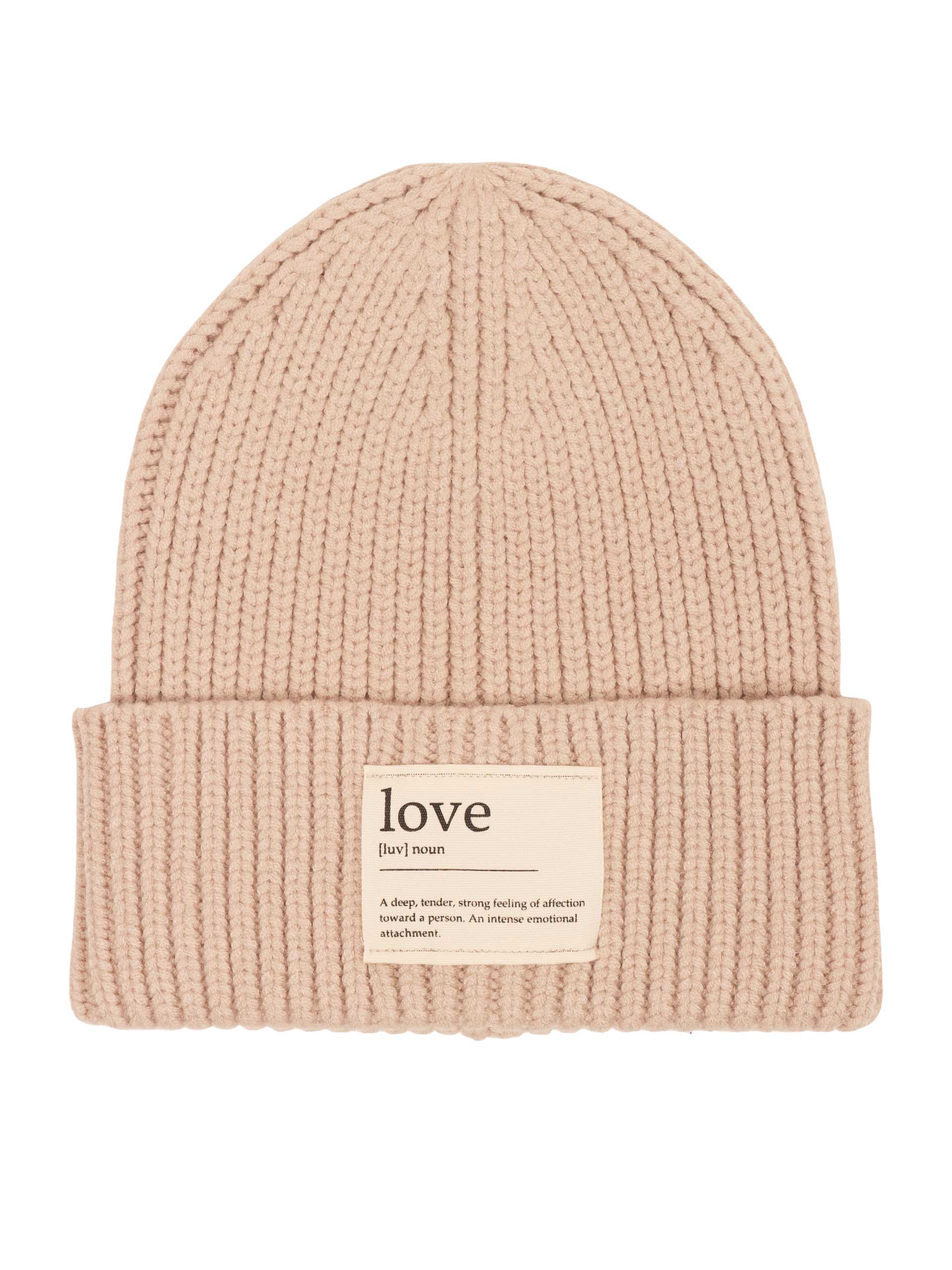 Gerippte Beanie in uni mit Umschlag. Mit einem großen Viskose Anteil ist sie besonders geeignet für Naturfaser-Liebhaber, die auf Wolle allergisch reagieren. Mit Kunstfasern gemischt wärmt sie dennoch gut, hat einen guten Stand und eine modisch angesagte Passform. Das optische Highlight aber ist der englische Lexikon-Auszug für Love, der auf dem Patch gestickt wurde. Witzig, stylisch, lässig, ein besonderes Accessoire, das für Gesprächstoff sorgen wird.