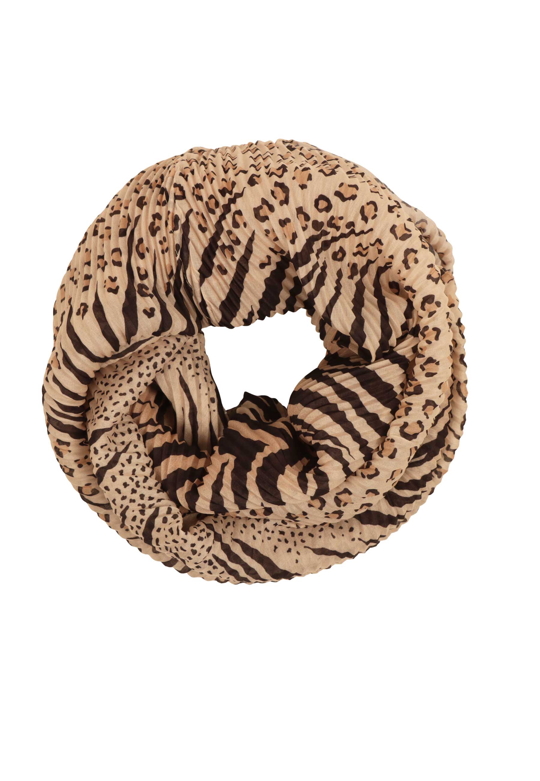 Weicher, plissierter Loop mit einem tonig gehaltenem Mix verschiedener Animalmuster. Er liegt wohlig eng am Hals und macht ein angenhmes Volumen.